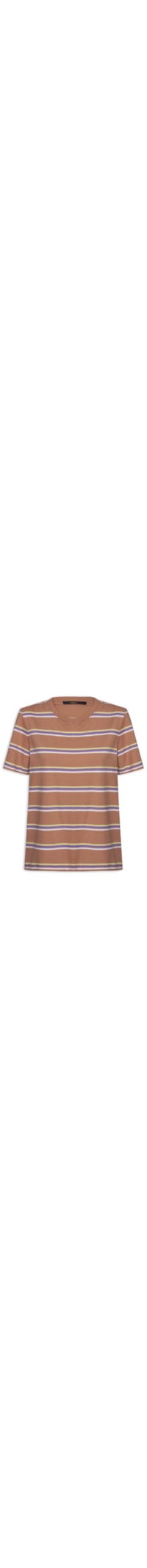 A camiseta marrom é confeccionada em malha leve com média elasticidade. A peça solta ao corpo possui decote arredondado, mangas curtas e padronagem de listras em cores contrastantes.