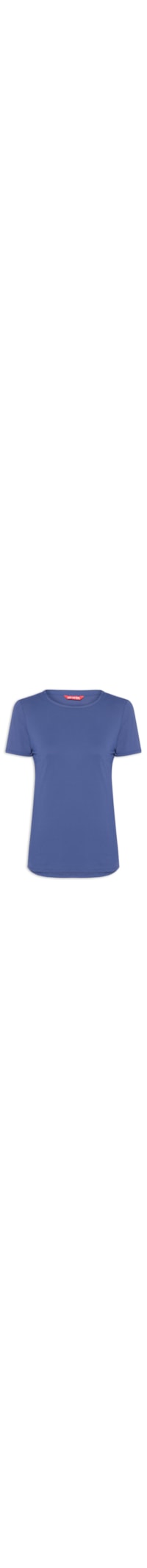 A camiseta azul é confeccionada em malha de poliamida sem elasticidade. A peça possui decote redondo, mangas curtas, ombros regulares, caimento levemente ajustado ao corpo, superfície lisa com leve textura, recortes laterais, barra levemente alongada e não possui fechamento.