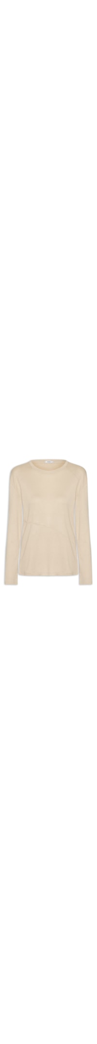 A camiseta bege é confeccionada em malha de leve com média elasticidade. A peça possui decote redondo com acabamento canelado, mangas longas, recortes frontais e acabamento pespontado.