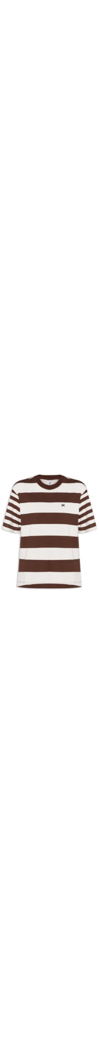 A camiseta off white é confeccionada por malha leve com média elasticidade. A peça solta ao corpo possui decote arredondado, mangas curtas e padronagem de listras em cores contrastantes.
