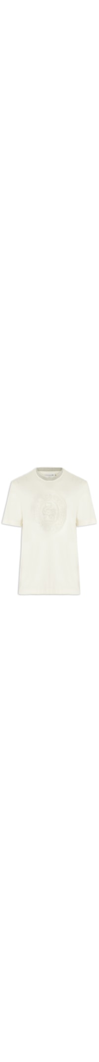 A camiseta off white é confeccionada em malha leve com média elasticidade. A peça solta ao corpo possui gola arredondada, mangas curtas, logo da marca bordado na parte frontal, detalhe de listras em cores contrastantes aplicados na gola.