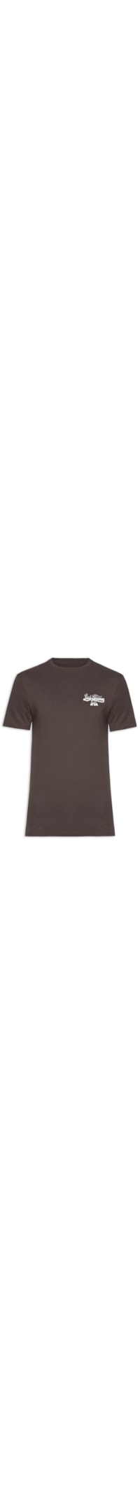 A camiseta marrom é confeccionada em malha de algodão com média elasticidade. A peça solta ao corpo possui gola careca com acabamento canelado, mangas curtas, tag da marca aplicada na parte lateral e estampas figurativas nas partes frontal e posterior.