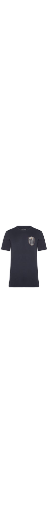 A camiseta azul é confeccionada em malha de algodão com média elasticidade. A peça solta ao corpo possui gola careca com acabamento canelado, mangas curtas e estampa figurativa de brasão aplicada em cor contrastante na altura do tórax.