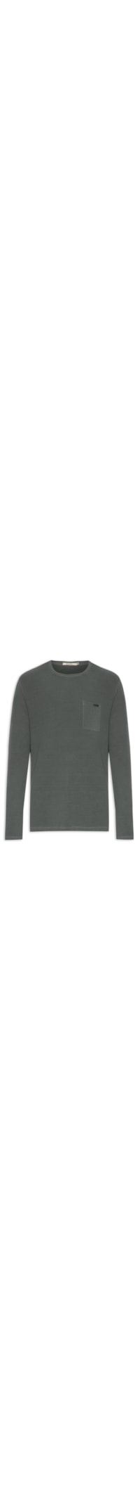 A camiseta cinza é confeccionada em malha de algodão com superfície texturizada. A peça possui gola careca com acabamento canelado, mangas longas, bolso com tag emborrachada da marca aplicados na altura do tórax, efeito estonado, shape solto, caimento reto e acabamento pespontado.