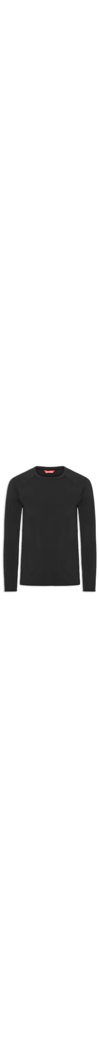 A camiseta preta é confeccionada em malha de poliamida com baixa elasticidade. A peça solta ao corpo possui gola careca, mangas longas e nome da marca aplicada na parte frontal em material refletivo.