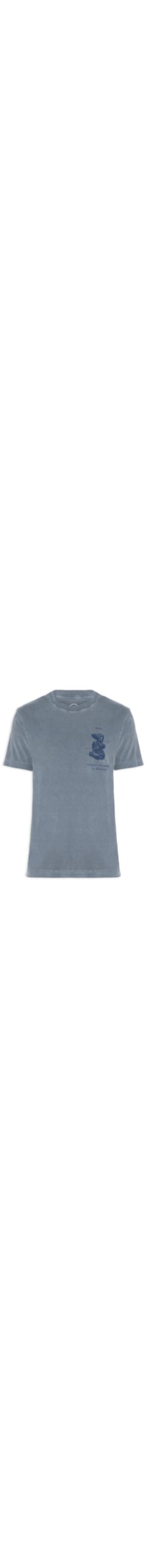A camiseta azul é confeccionada em malha de algodão com média elasticidade. A peça solta ao corpo possui gola redonda, mangas curtas e estampa escrita aplicada na parte frontal em cor contrastante, acabamento canelado e efeito estonado.