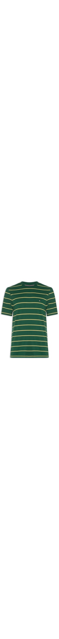 A camiseta verde é confeccionada em malha leve com baixa elasticidade. A peça solta ao corpo possui gola arredondada, mangas curtas, logo da marca bordado na parte frontal e padronagem de listras em cor contrastante.