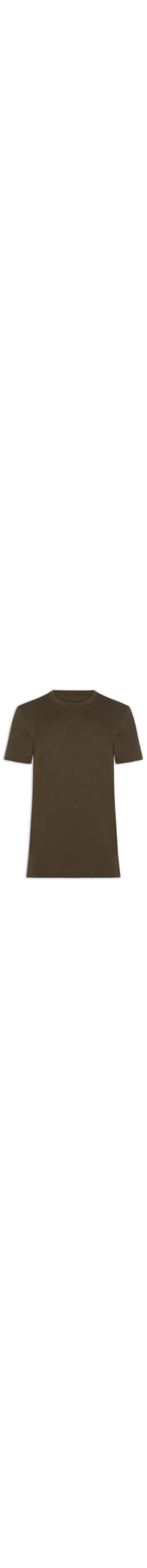 A camiseta marrom é confeccionada por malha leve com média elasticidade. A peça possui gola careca com acabamento canelado e mangas curtas.