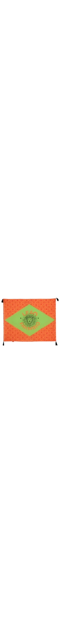 A canga laranja é produzida em tecido leve. A peça possui formato retangular amplo, estampa localizada com mix de elementos gráficos e tropicais, destaque central em cor contrastante com aplicação de leão e nome da marca, além de padronagem repetida ao fundo e acabamento com franjas nas extremidades.