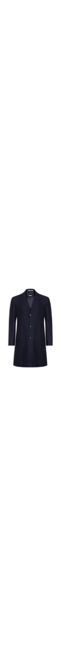O casaco azul é confeccionado em lã mista sem elasticidade. A peça solta ao corpo possui lapela chanfrada, mangas longas com abotoamento nos punhos, ombros estruturados, bolsos frontais embutidos com lapela, bolso interno, recorte posterior com fenda central, forro interno estampado, comprimento alongado e fechamento frontal por botões.