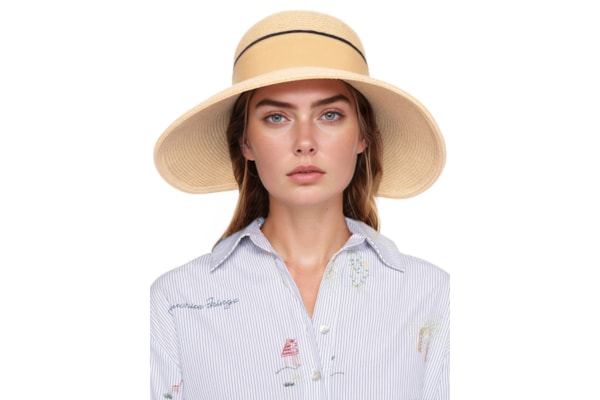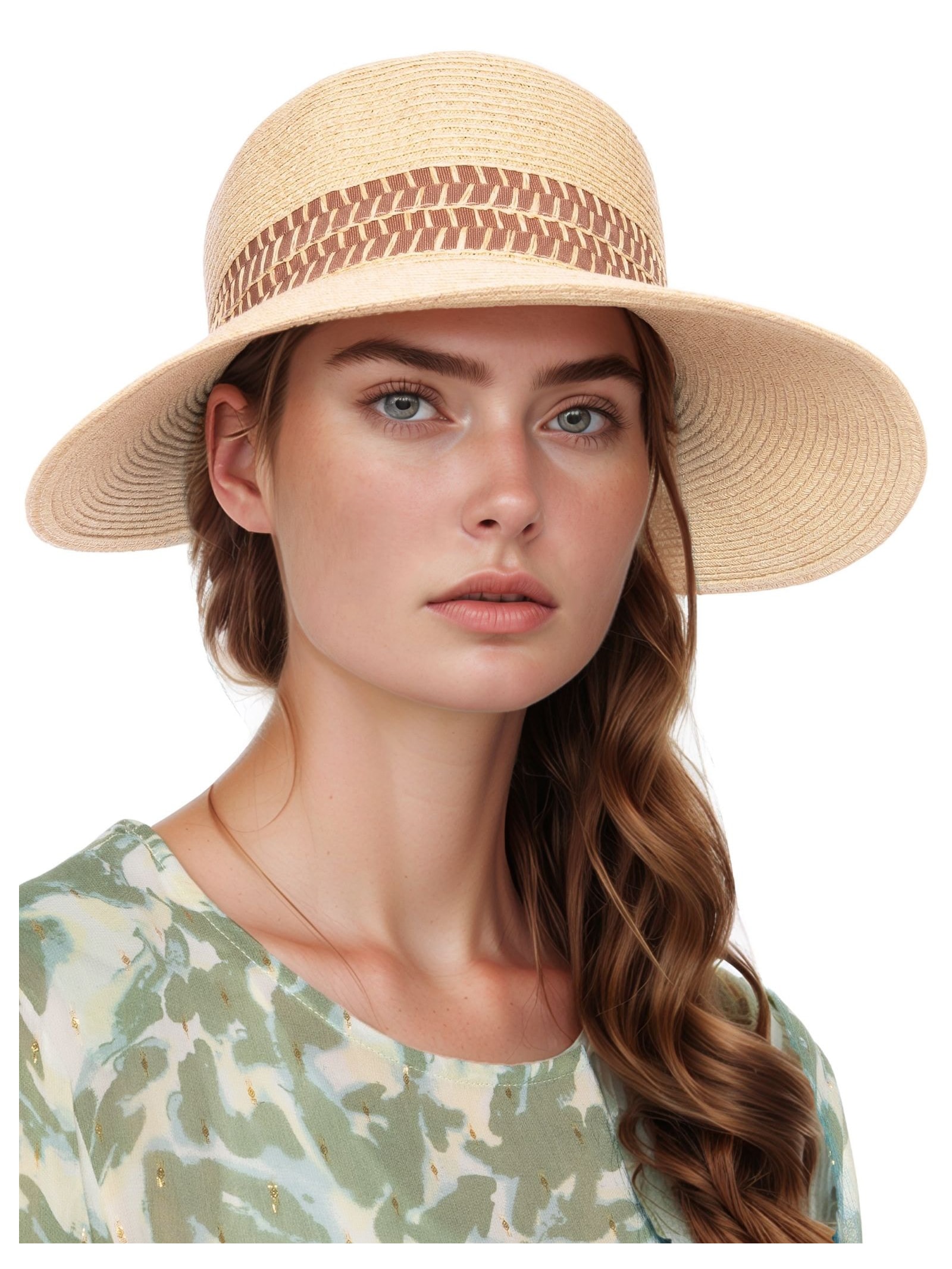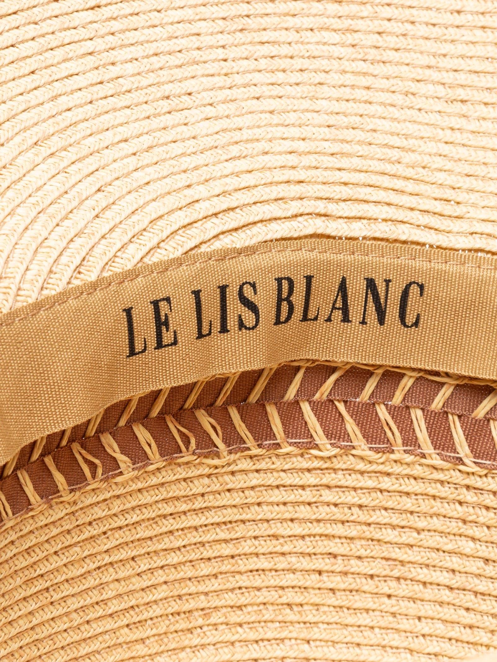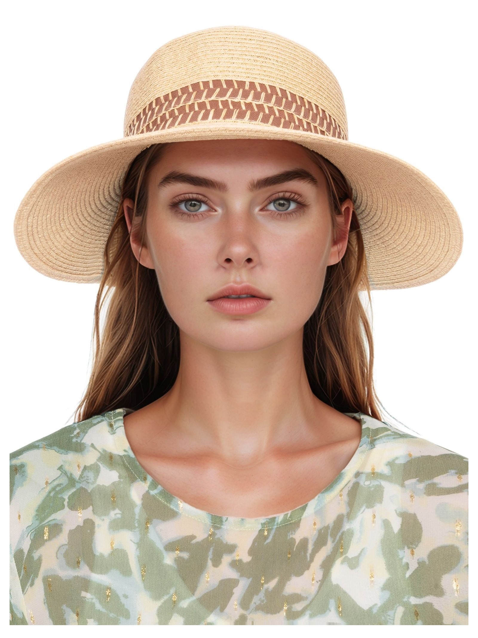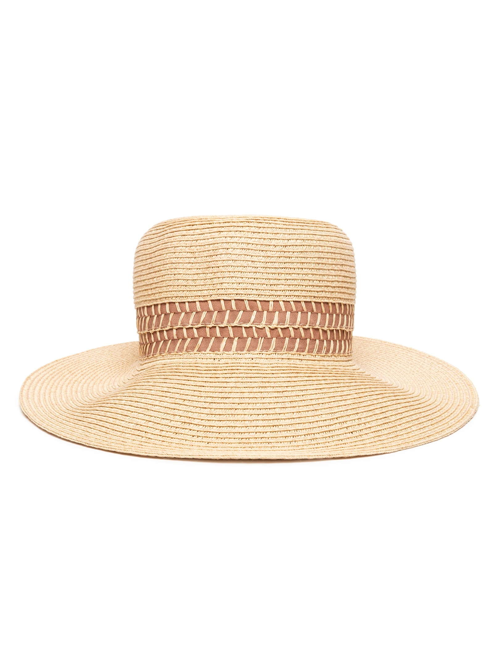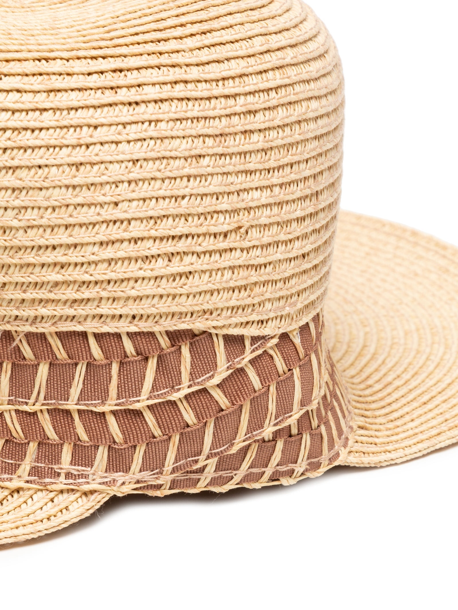 O chapéu bege é produzido em palha. A peça possui copa arredondada, aba larga e faixa na cor marrom com detalhes em cor contrastante aplicada na copa.