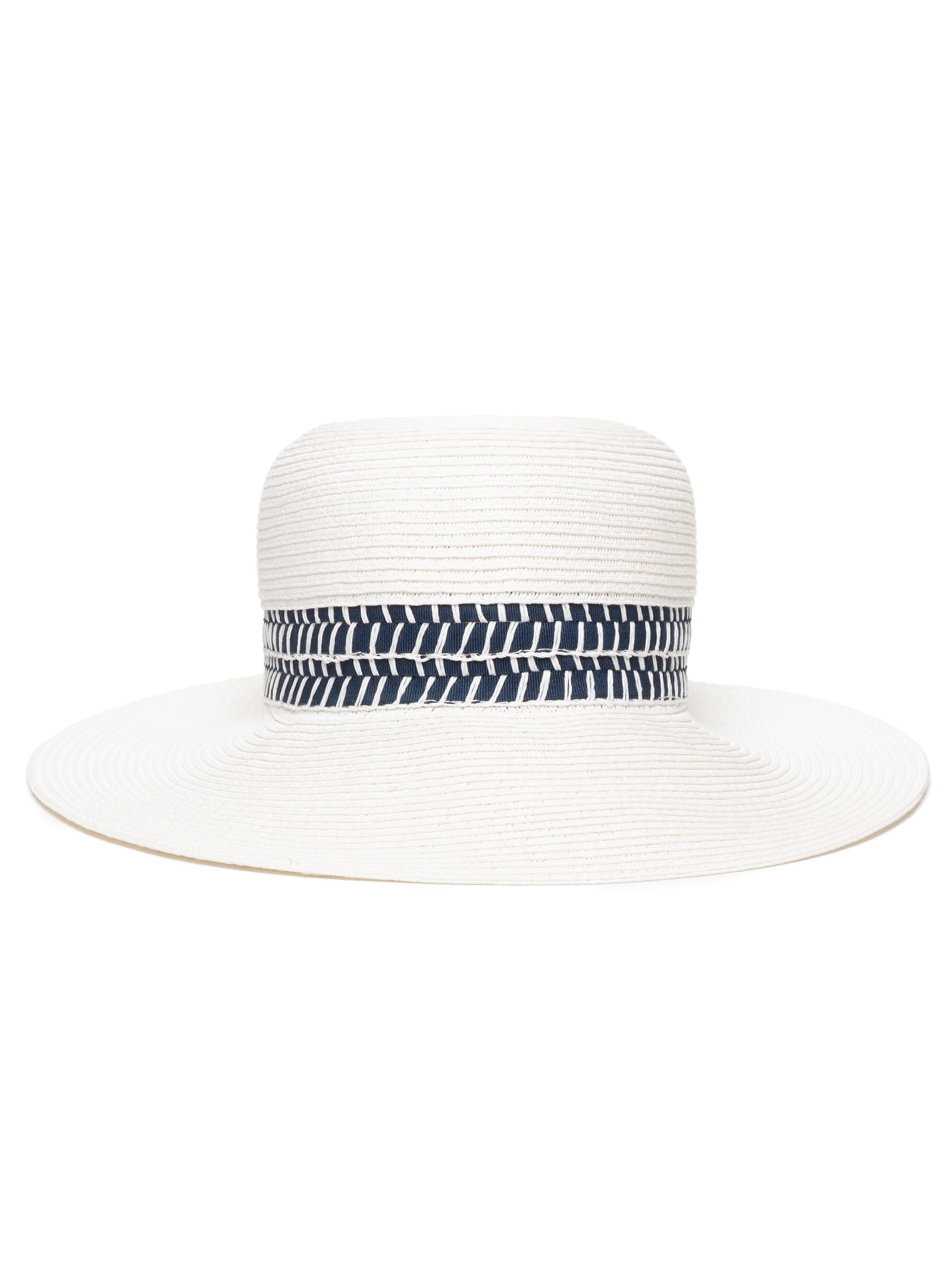 O chapéu off white é produzido em palha. A peça possui copa arredondada, aba larga e faixa na cor azul marinho com detalhes em cor contrastante aplicada na copa.