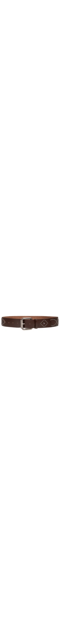 O cinto marrom é produzido em couro. A peça possui espessura média, passante fixo, detalhe figurativo geométrico com taxas metálicas em formato arredondado aplicadas, 7 perfuros e fechamento frontal por fivela metálica texturizada regulável.