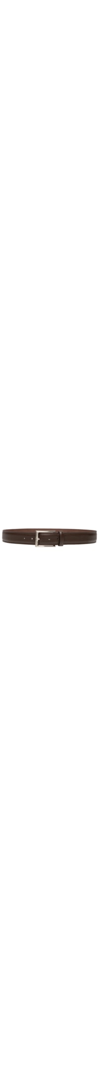 O cinto marrom é produzido em couro. A peça possui espessura média, passante fixo, 5 perfuros, aplicação discreta de logo em baixo-relevo na extremidade e fechamento por fivela retangular regulável com acabamento polido.