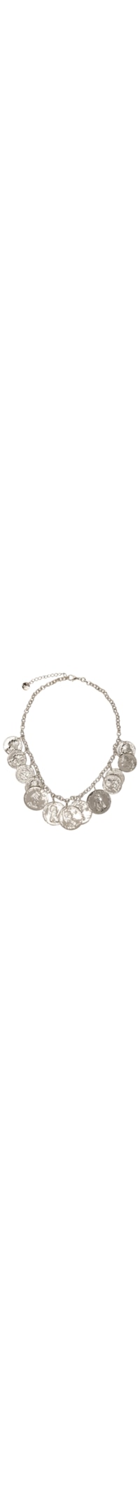 O colar prateado é produzido em metal banhado a ródio. A peça possui tamanho médio, formato arredondado com acabamento polido, aplicação de medalhas de diferentes tamanhos com gravuras em relevo e fechamento posterior por fecho lagosta com corrente extensora.