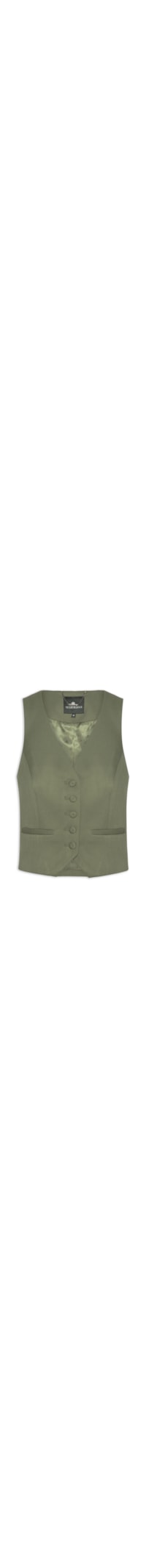O colete verde é confeccionada em tecido leve sem elasticidade. A peça solta ao corpo possui decote V, alças médias, cavas levemente alongadas, bolsos frontais decorativos, recortes nas partes frontal e posterior, barra assimétrica, forro, comprimento cropped* e fechamento frontal por botões.