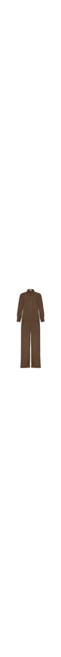 O conjunto marrom é confeccionado em malha de algodão sem elasticidade. A camisa solta ao corpo possui colarinho clássico, mangas longas com abotoamento nos punhos, ombros levemente deslocados e fechamento frontal por botões. A calça solta ao corpo possui cintura alta, cós com elástico embutido na parte posterior, bolsos frontais modelo faca, recortes frontais, forro, comprimento longo e fechamento frontal por botão e zíper.