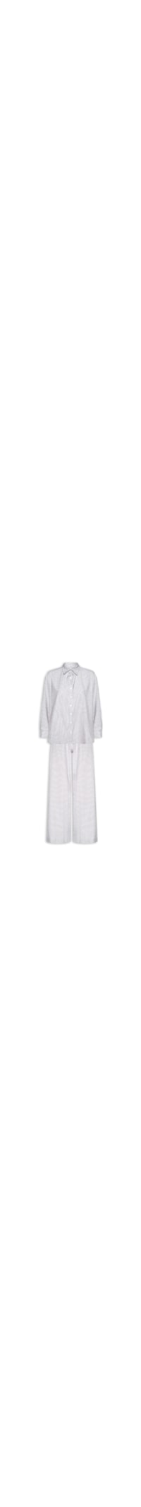 O conjunto preto é confeccionado em tecido leve com toque de linho e sem elasticidade. A camisa solta ao corpo possui colarinho clássico, mangas longas com ajuste nos punhos, barra mullet arredondada, padronagem de listras na cor branca e fechamento frontal por botões. A calça possui cintura alta, cós com elástico e cordão para ajuste frontal embutidos, bolsos frontais modelo faca, bolsos posteriores decorativos, padronagem de listras na cor branca e comprimento longo.