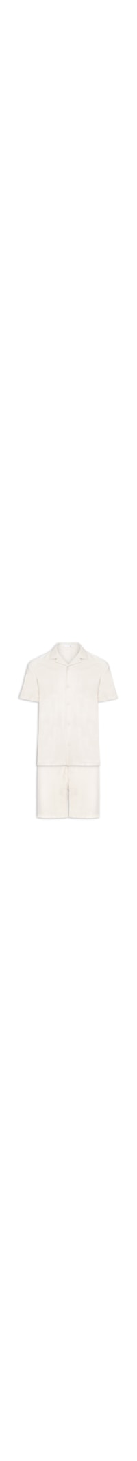 O conjunto bege é confeccionado em linho misto sem elasticidade. A camisa solta ao corpo possui colarinho clássico, mangas curtas e fechamento frontal por botões. O short solto ao corpo possui cintura média, cós com passantes, bolsos frontais modelo faca, bolsos posteriores embutidos, pences posteriores, comprimento curto e fechamento frontal por botão e zíper.