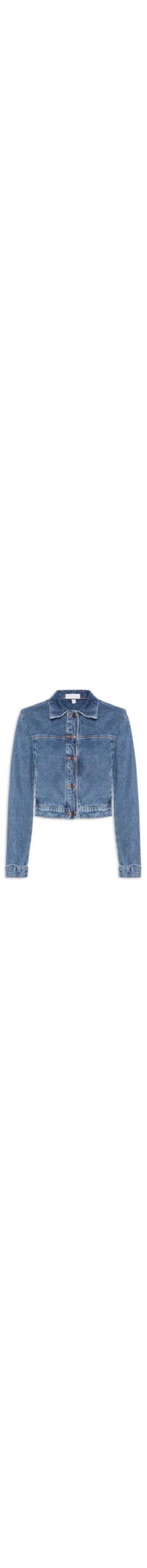 A jaqueta azul é confeccionada em sarja com lavagem jeans sem elasticidade. A peça solta ao corpo possui colarinho simples, ombros estendidos, mangas longas com abotoamento nos punhos, recortes frontais e posteriores, bolsos frontais embutidos, comprimento cropped* e fechamento frontal por botões.