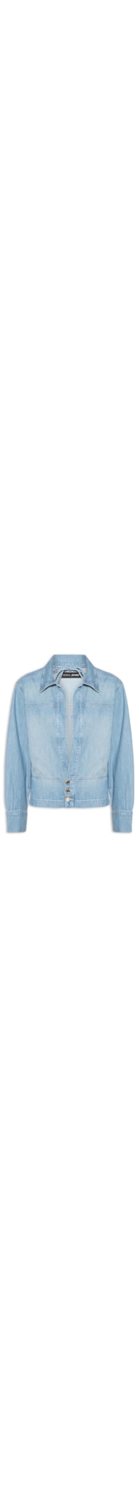 A jaqueta azul é confeccionada em sarja com lavagem jeans e sem elasticidade. A peça solta ao corpo possui colarinho clássico com recorte em V profundo, mangas longas com ajuste nos punhos, martingales aplicados nas laterais, recortes frontais e posteriores, efeito estonado e fechamento frontal por botões. Acompanha top de modelo cortininha da mesma cor e tecido para uso opcional.