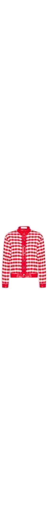 A jaqueta vermelha é confeccionada em tecido leve com superfície texturizada e sem elasticidade. A peça solta ao corpo possui gola alta, mangas longas com abotoamento de pressão nos punhos, tag da marca aplicada em metal na parte posterior, detalhes nas partes posterior e frontal e punhos em material sintético, padronagem xadrez na cor branca e fechamento frontl por botões de pressão.