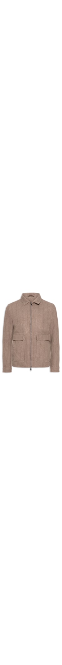 A jaqueta bege é confeccionada em tecido encorpado sem elasticidade. A peça solta ao corpo possui gola esporte, mangas longas com ajuste nos punhos com fecho por botão, bolsos frontais embutidos com aba sobreposta, forro, bolso interno, recortes posteriores e fechamento frontal por zíper.