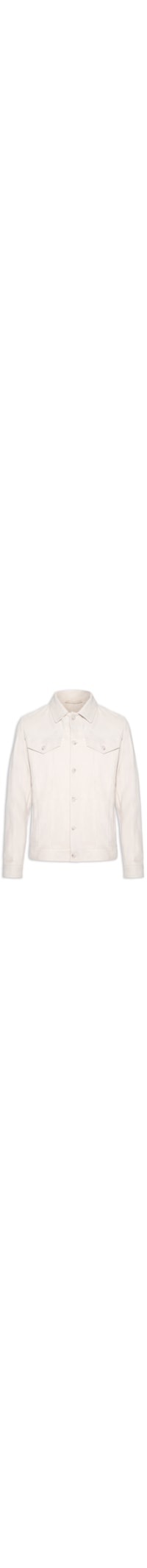 A jaqueta off white é confeccionada em suede. A peça solta ao corpo possui colarinho clássico, mangas longas com abotoamento, bolsos frontais modelo faca, bolsos frontais embutidos com fechamento por aba sobreposta e botão, recortes nas partes frontal e posterior, nome da marca metalizado aplicado na parte posterior e fechamento frontal por botões.