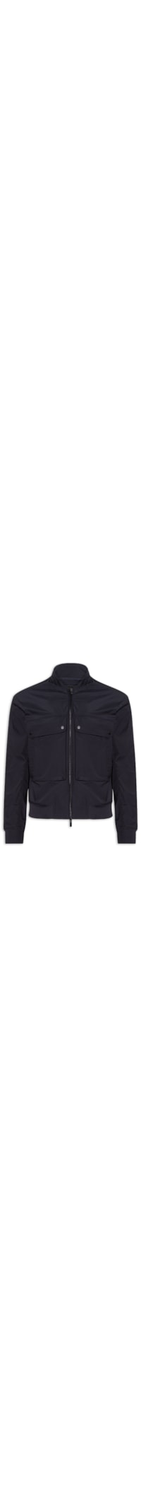 A jaqueta azul marinho é confeccionada em nylon com baixa elasticidade. A peça solta ao corpo possui gola padre, mangas longas com ajuste nos punhos, bolsos frontais com aba sobreposta e fechamento por botão, acabamento canelado na barra, tag da marca emborrachada aplicada na parte posterior na altura da gola e fechamento frontal por zíper.
