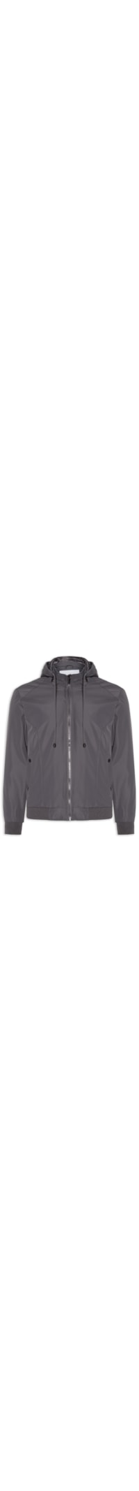 A jaqueta cinza é confeccionada em tactel sem elasticidade. A peça solta ao corpo possui gola alta, gorro regulável e removível, mangas longas com ajuste nos punhos, bolsos frontais modelo faca com fechamento por botões, recortes na parte frontal, forro em matelassê, barra ajustada e fechamento frontal por zíper.
