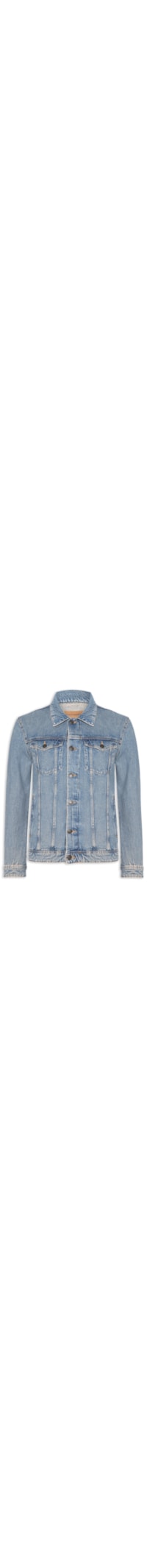 A jaqueta azul é confeccionada em sarja com lavagem jeans sem elasticidade. A peça solta ao corpo possui colarinho clássico, mangas longas com botões nos punhos, bolsos frontais com fechamento por aba e botão, bolsos frontais modelo faca, bolso interno, recortes frontais e posteriores, martingale na barra posterior e fechamento frontal por botões.