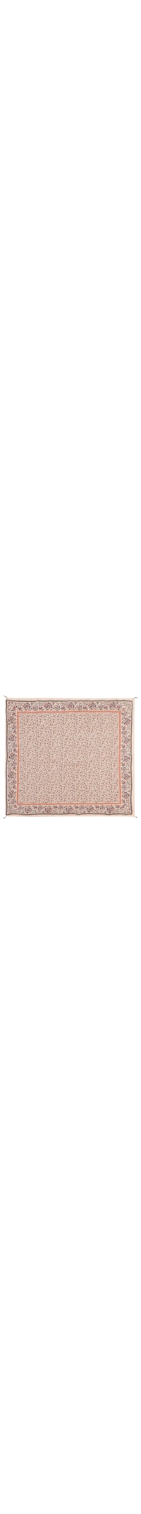 O lenço bege é confeccionado em tecido leve sem elasticidade. A peça possui tamanho médio, formato retangular, detalhe de aviamento metálico pendurado nas bordas e estampa floral em cores contrastantes.