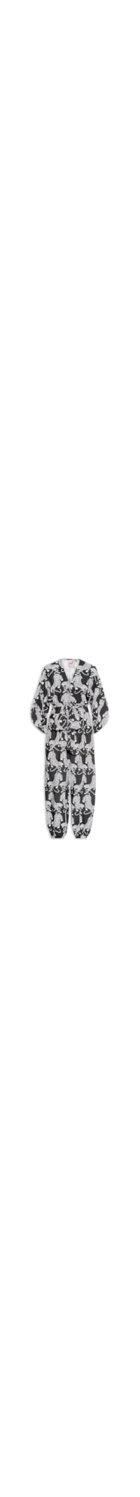 O macacão preto é confeccionado em tecido leve sem elasticidade. A peça solta ao corpo possui decote V, mangas 3/4 com elástico embutido nos punhos, bolsos frontais, recorte na altura do busto, elático embutido na parte posterior na altura da cintura, estampa figurativa de tigres em cor contrastante, comprimento longo, acabamento pespontado e fechamento frontal por zíper invisível e faixas para amarração.