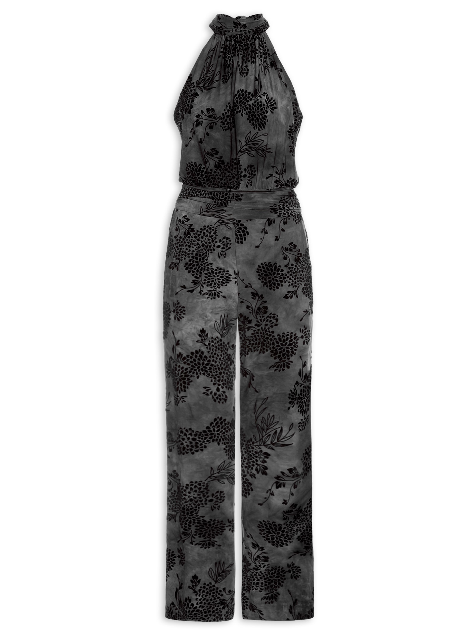 O macacão preto é confeccionada em malha leve com superfície texturizada e alta elasticidade. A peça solta ao corpo possui decote halter com fechamento pos amarração na parte posterior, cavas alongadas, recorte vazado na parte posterior, bolsos frontais embutidos, lastex aplicado na parte posterior, tecido aplicado na cintura com detalhe franzido e efeito drapeado, estampa floral na cor preta e comprimento longo.