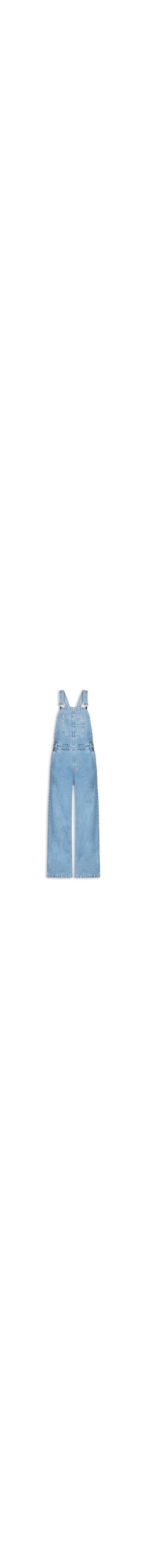 A jardineira azul é confeccionado em sarja com lavagem jeans sem elasticidade. A peça solta ao corpo possui decote reto, alças médias com regulagem e removíveis por botões, cavas alongadas, bolsos frontais e posteriores embutidos, passantes aplicados na cintura, recortes frontais e posteriores, comprimento longo e fechamento lateral por botões.