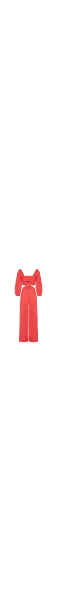O macacão vermelho é confeccionado em tecido leve com toque de linho sem elasticidade. A peça solta ao corpo possui decote quadrado, mangas 7/8 bufantes, faixas alongadas na parte posterior para amarração, pences posteriores, bolsos posteriores, bolsos frontais embutidos, aplicação frontal de argola na cor bege, detalhe de franzidos na parte frontal, comprimento longo e fechamento posterior por zíper invisível.
