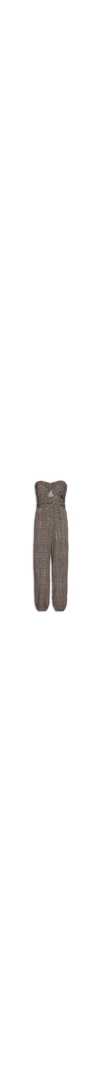 O macacão preto é confeccionado em malha leve sem elasticidade. A peça solta ao corpo de modelo tomara que caia possui decote coração, recorte vazado na parte frontal, mix de estampas em cores contrastantes, elástico embutido na barra e comprimento longo.