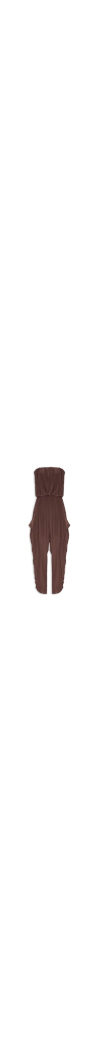O macacão marrom é confeccionado em tecido leve com baixa elasticidade. A peça de modelo tomara que caia possui decote reto, tecido sobreposto e elástico embutido na altura da cintura, bolsos frontais modelo faca, superfície com efeito franzido, comprimento cropped*.