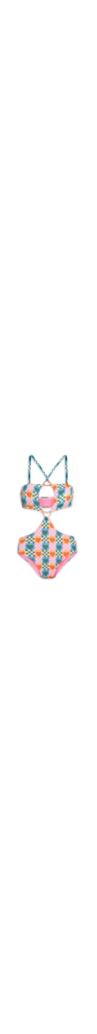 O maiô rosa é confeccionado em malha cirrê com alta elasticidade. A peça possui decote reto, tiras finas com regulagem na parte posterior, recortes frontais e laterais vazados, forro, mix de estampas em cores contrastantes e detalhe de aviamento em formato figurativo de coração na parte frontal.