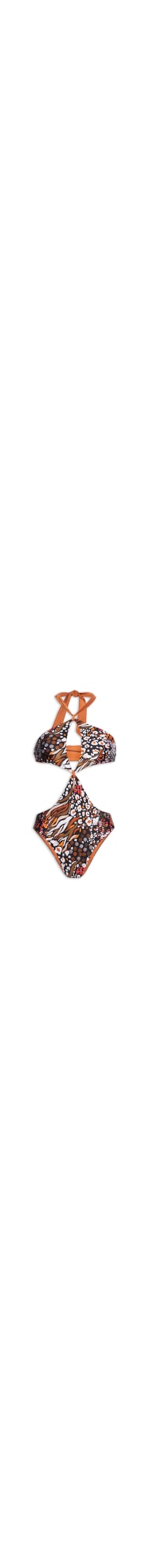 O maiô marrom é confeccionado em malha cirrê com alta elasticidade. A peça de modelo dupla face possui decote halter, alças em faixas médias estendidas para amarração, recorte frontal vazado na altura do busto, recortes laterais vazados, forro, mix de estampa em cores contrastantes, bojo removível e forro. A outra face possui mix de estampas em cores contrastantes.