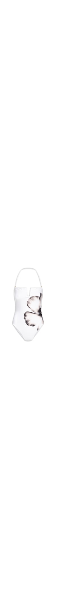 O maiô branco confeccionado em malha de poliamida com média elasticidade. A peça possui decote meia taça, alças finas removíveis, recorte vazado com aro de sustentação embutido na altura do busto, padronagem floral em cor contrastante e forro.