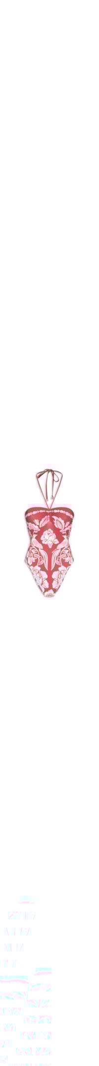 O maiô vermelho é confeccionado em malha de poliamida com baixa elasticidade. A peça justa ao corpo possui decote halter, alças finas com ponteiras com miçangas aplicadas, efeito franzido na altura do busto, tiras médias alongadas na parte posterior, recorte vazado na parte posterior, forro, estampa figurativa em cor contrastante e fechamento posterior por amarração.