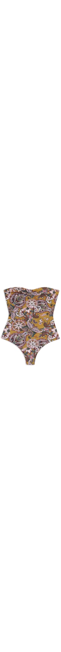 O maiô amarelo é confeccionado em malha de poliamida. A peça justa ao corpo de modelo tomara que caia possui decote reto, franzido central na altura do busto e mix de estampas em cor contrastante.