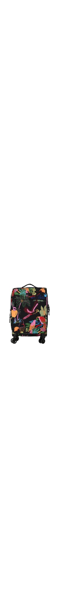 A mala preta é produzida em lona. A peça possui tamanho pequeno, formato retangular, estrutura rígida, compartimento interno amplo com forro em tactel, faixas de gorgurão com fecho por encaixe, 2 bolsos internos amplos com fechamento por zíper, sendo 1 bolso em material sintético branco com transparência, extensor na parte frontal com fechamento por zíper, bolso frontal embutido com fechamento por zíper com puxador em cordão com detalhe figurativo de caju em borracha com cores contrastantes com etiqueta de identificação na parte posterior, faixa de gorgurão na parte superior, alças de mão em gorgurão nas partes lateral e superior, faixa e alças com detalhe do nome da marca em baixo-relevo, tag da marca aplicada em borracha na parte frontal, puxador metálico retrátil em cor contrastante na parte superior, detalhe de bases para apoio em material sintético na parte lateral, mix de estampas em cores contrastantes, cadeado integrado na parte lateral, 4 rodas multidirecionais e fechamento frontal por zíper com puxador.