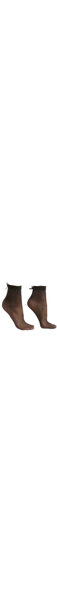 Meia curta transparente feminina com elegante acabamento ondulado. Possui um efeito cintilante devido às bolinhas com glitter e um toque chique com o laço preto e detalhes dourados. Perfeita para adicionar um toque de glamour a qualquer look.