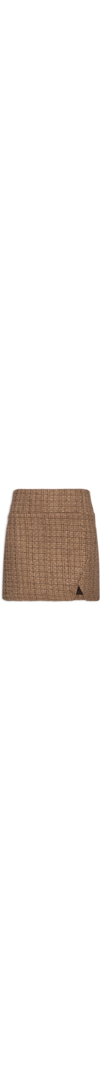 A mini saia marrom é confeccionada em tweed com fios de lurex e sem elasticidade. A peça solta ao corpo possui cintura alta, cós estendido, fenda frontal, pences posteriores, forro, comprimento mini e fechamento lateral em zíper invisível.