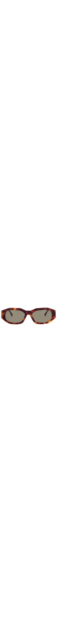 O óculos de sol marrom é produzido em acetato. A peça possui formato retangular com bordas assimétricas, lentes escuras com proteção UV/UVB, alças largas com logo da marca timbrado, efeito tartaruga e acabamento polido.