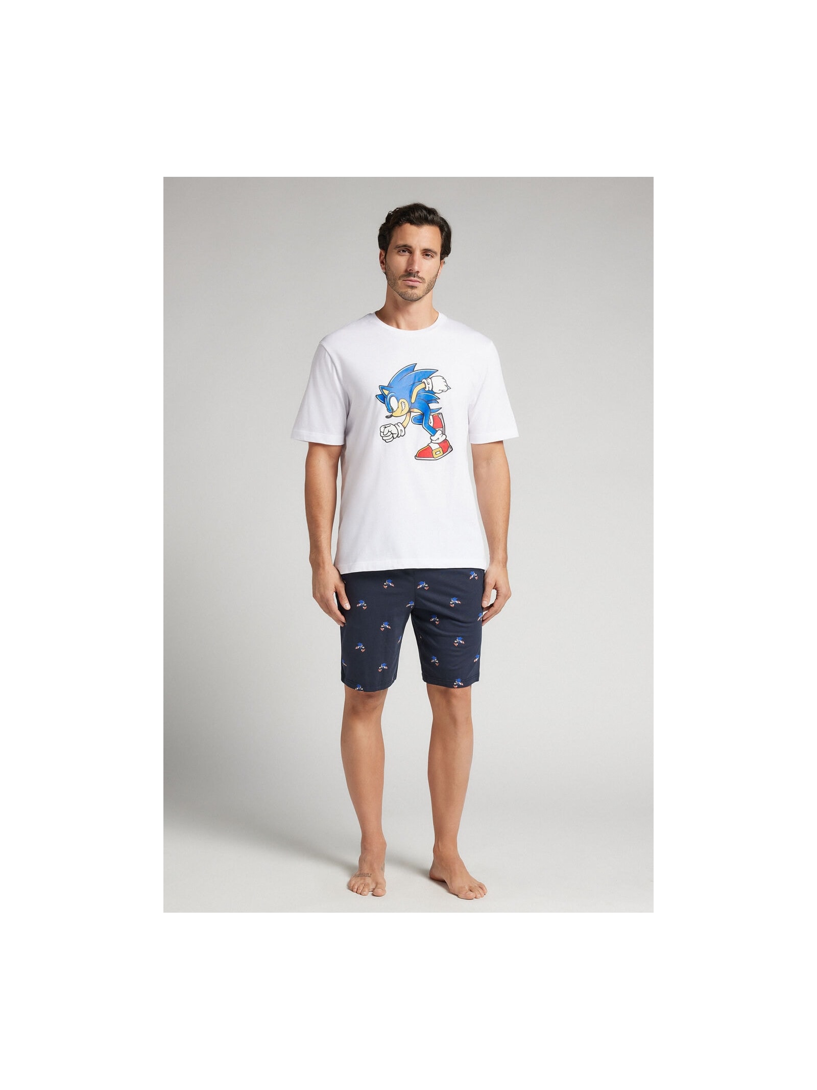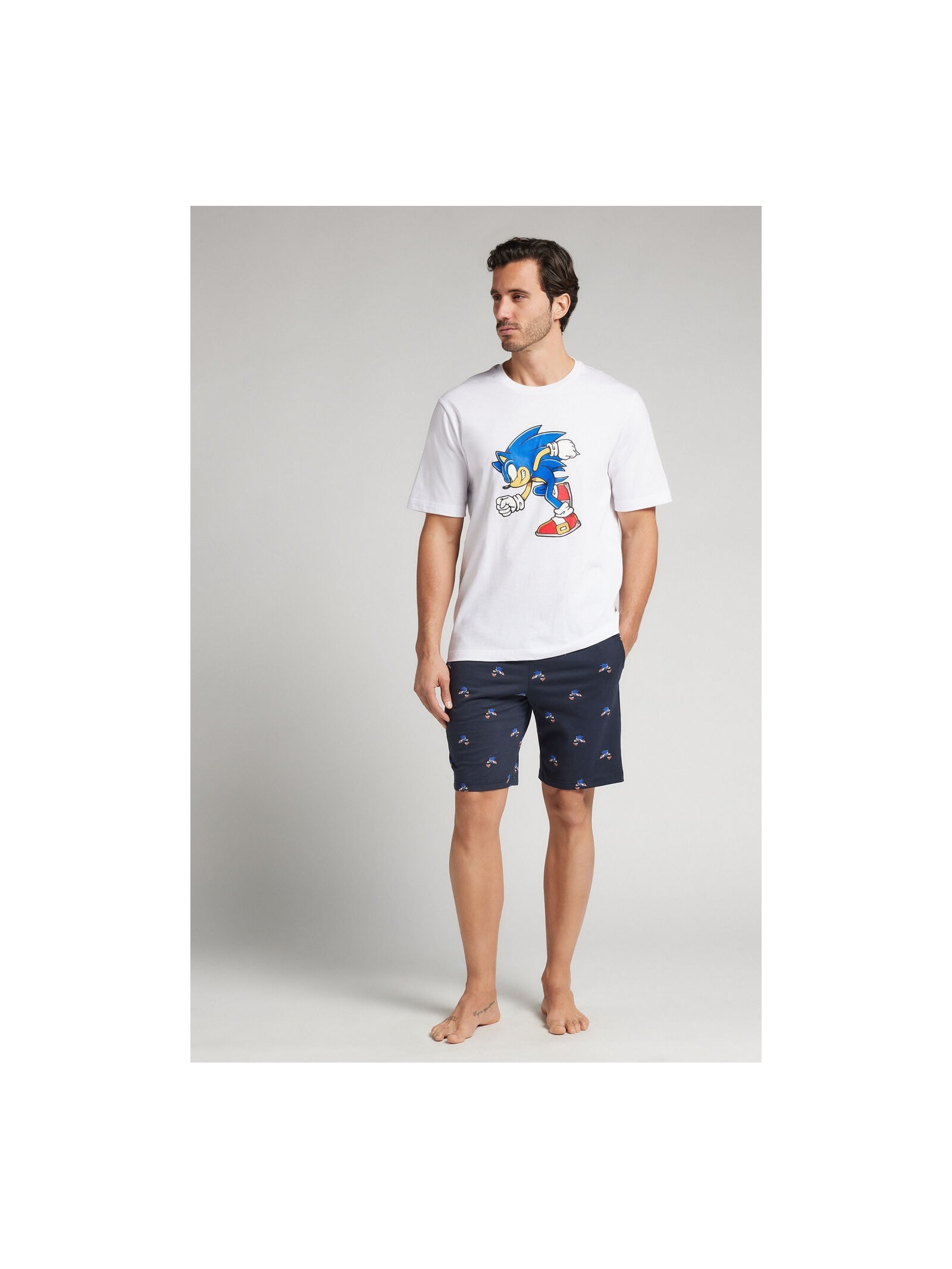 Pijama curto em jersey de algodão, com estampa do Sonic na camiseta. A calça tem estampa integral em micro padrão do personagem.