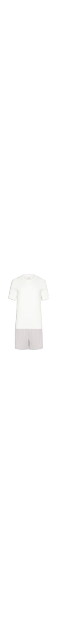 O pijama bege é confeccionado em malha de algodão com baixa elasticidade. A peça solta ao corpo possui camiseta com gola careca com detalhe de botões, mangas curtas, levemente canelada e acabamento pespontado. O short na cor cinza possui cintura média, cós elástico e comprimento curto.