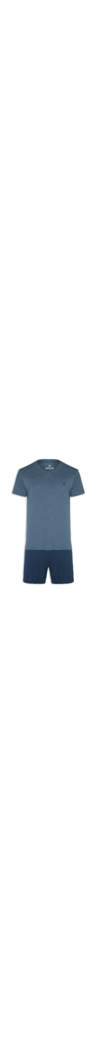 O pijama azul é confeccionado em malha leve. A camiseta possui gola V com acabamento canelado, mangas curtas, logo da marca aplicado em silk na altura do tórax, shape solto, caimento reto e acabamento pespontado. O short possui cintura média, cós com elástico embutido, comprimento curto, shape solto, caimento reto e acabamento pespontado